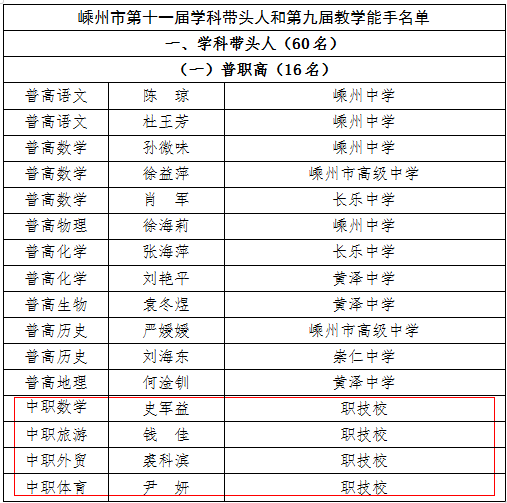 近日,嵊州市第十一屆學(xué)科帶頭人和第九屆教學(xué)能手評選結(jié)果揭曉,我校推薦參評的史軍益、錢佳、裘科濱、尹妍4位教師榮獲嵊州市十一屆學(xué)科帶頭人稱號。