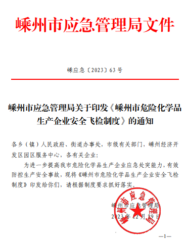 為提高我市危險(xiǎn)化學(xué)品生產(chǎn)企業(yè)應(yīng)急處突能力,有效防控安全生產(chǎn)事故,近期,嵊州市應(yīng)急管理局印發(fā)《嵊州市危險(xiǎn)化學(xué)品生產(chǎn)企業(yè)安全飛檢制度》,定期對(duì)危險(xiǎn)化學(xué)品生產(chǎn)企業(yè)開(kāi)展不提前告知的突擊現(xiàn)場(chǎng)檢查,進(jìn)一步強(qiáng)化危險(xiǎn)化學(xué)品生產(chǎn)企業(yè)安全管理,督促生產(chǎn)經(jīng)營(yíng)單位落實(shí)主體責(zé)任。