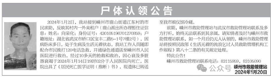 2024年1月2日,我站接到嵊州市鹿山街道江東村的市民求助,反映其村內(nèi)一外來租戶(鹿山派出所辦理暫住證信息:姓名:向榮化;身份證號:420105196701270859;戶籍地址:湖北省武漢市硚口區(qū)寶豐二路5-1號7樓2號),因病臥床多日,處于生病及生活無著狀態(tài),我站工作人員隨即配合市民撥打120電話急救,開通綠色通道送至嵊州市人民醫(yī)院進行救治,經(jīng)過10多天的搶救和救治,因心衰及多臟器衰竭于2024年1月14日19時02分于人民醫(yī)院內(nèi)死亡,醫(yī)院出具了《居民死亡醫(yī)學(xué)證明(推斷)書》,現(xiàn)遺體已轉(zhuǎn)送至我市殯儀館冷藏。