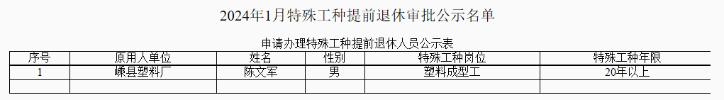 經(jīng)申報,我局已受理陳文軍特殊工種提前退休申請,現(xiàn)予以公示,公示期間(公示時間自1月22日至1月28日)如有異議,在公示期限內(nèi),有關(guān)人員均可實事求是向我局反映問題,在反映時應(yīng)署真實姓名并提供必要的調(diào)查線索(信函以寄發(fā)日郵戳為準(zhǔn))。