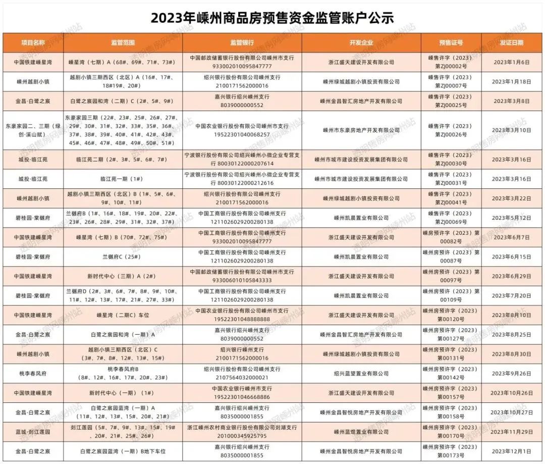 據(jù)統(tǒng)計2023年截止12月31日嵊州全市共辦理20個預(yù)售(現(xiàn)售),涉及到監(jiān)管賬戶20個。資金監(jiān)管賬戶的開通也是項目取得預(yù)售證的關(guān)鍵一步。