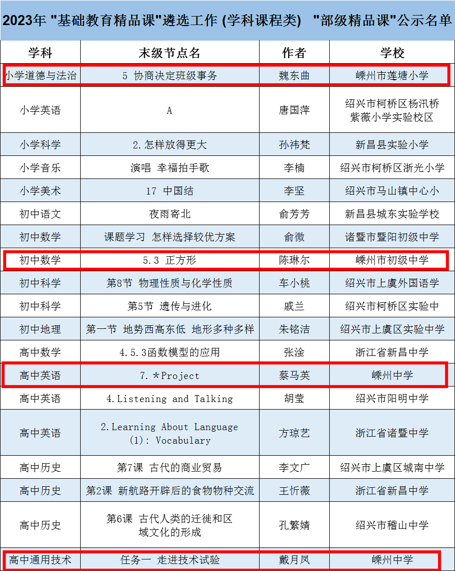 本屆活動全國共有6萬多所學(xué)校的22萬余名教師報名參與,教育部組織專家從目標(biāo)內(nèi)容、教學(xué)過程、教學(xué)資源、技術(shù)規(guī)范等方面對推薦精品課進行評審,最終公示了部級精品課學(xué)科課程類4473節(jié)、實驗教學(xué)類876節(jié)、特殊教育類170節(jié)。嵊州市小學(xué)、初中、高中三個學(xué)段共有5節(jié)課例入選。