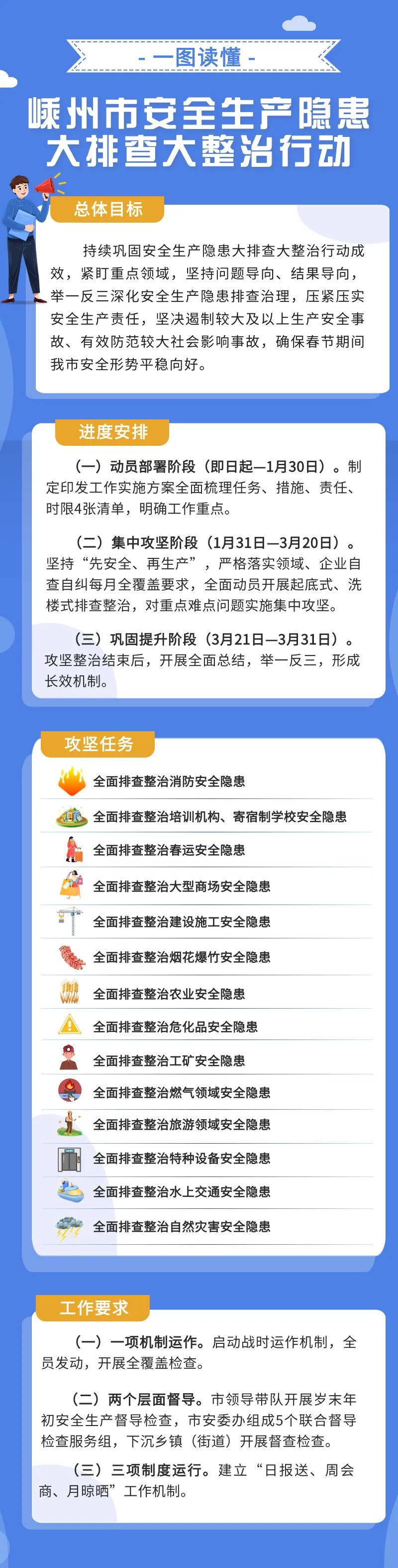 為深入貫徹落實(shí)習(xí)近平總書記近期關(guān)于安全生產(chǎn)和消防安全工作會(huì)議精神,確保春節(jié)期間安全有序,我市安全形勢(shì)平穩(wěn)向好,決定即日起至3月底開展安全生產(chǎn)隱患大排查大整治行動(dòng)。