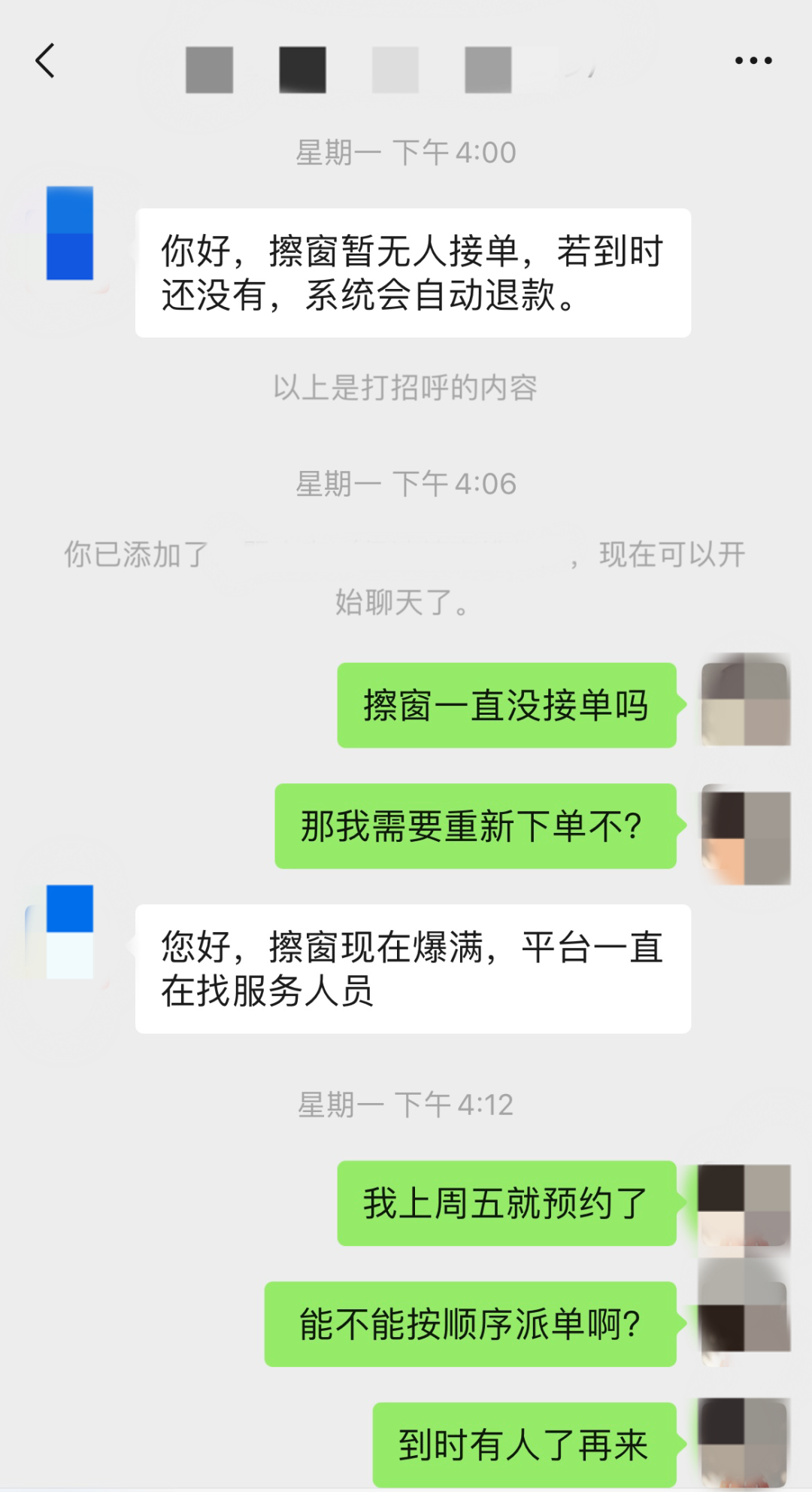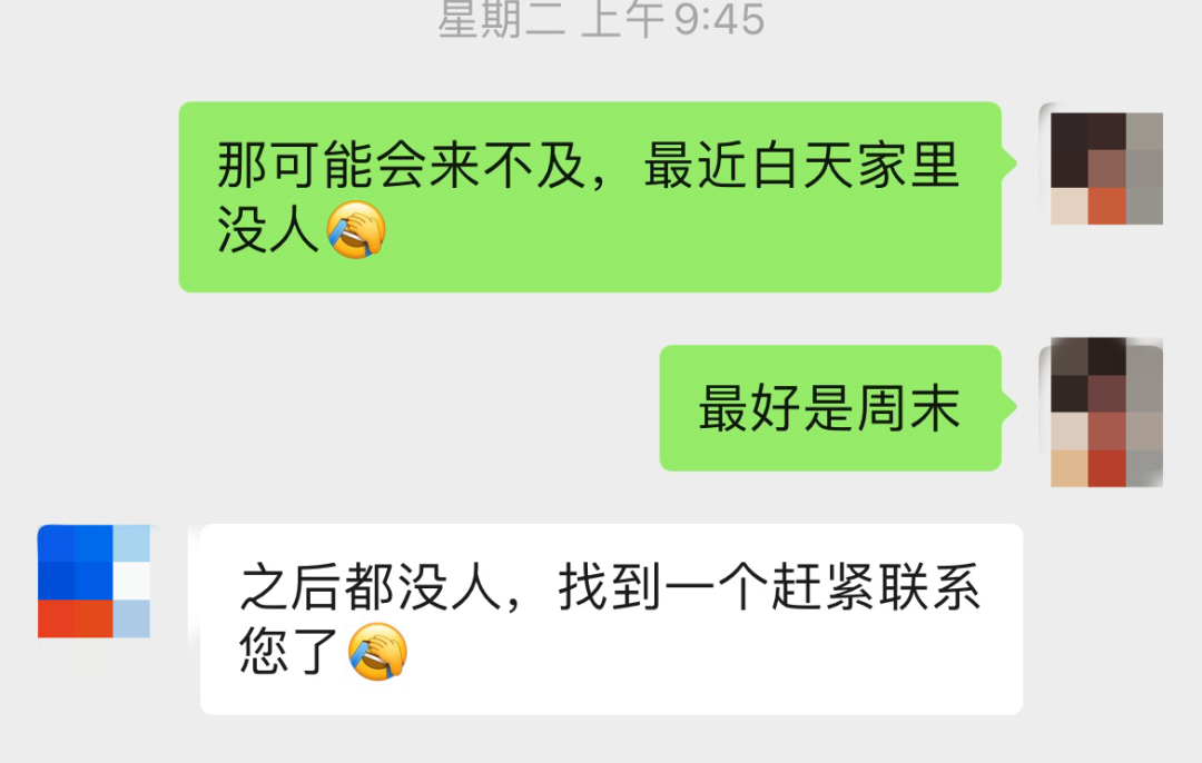 不過幸運的是,一天后,客服再次聯(lián)系了俞女士,因為顧客跑單,所以有位阿姨有檔期。但由于是臨時空出來的,只能在當天下午過來,并不是俞女士之前預約的周末時間。