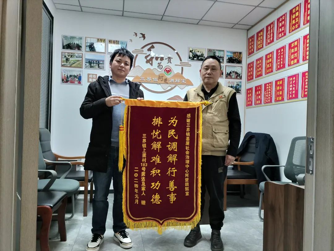 “阿楚”調解室負責人王楚根告訴記者,其實該案件的其中一個當事人早在2019年10月就送來過一個錦旗,想不到五年過去了,另一個當事人還會記著我們調解室。王楚根打開手機,給我們看了那年的錦旗,往事歷歷在目。