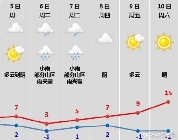 預(yù)計(jì)6-7日紹興平原地區(qū)有小雨或小雨夾雪,山區(qū)有小雨夾雪或小雪;并且受冷空氣影響,6日最低氣溫平原地區(qū)0~-1℃有薄冰,山區(qū)-1~-4℃有冰凍。
