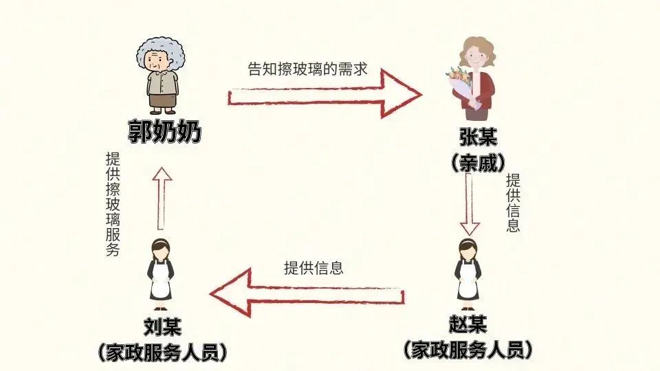 2023年農(nóng)歷春節(jié)前夕,郭奶奶將過年擦玻璃的需求告訴了親戚張某,經(jīng)張某和家政服務(wù)人員趙某介紹,家政人員劉某前往郭奶奶位于居民樓二樓的家中擦洗玻璃,后從二樓窗戶墜亡。