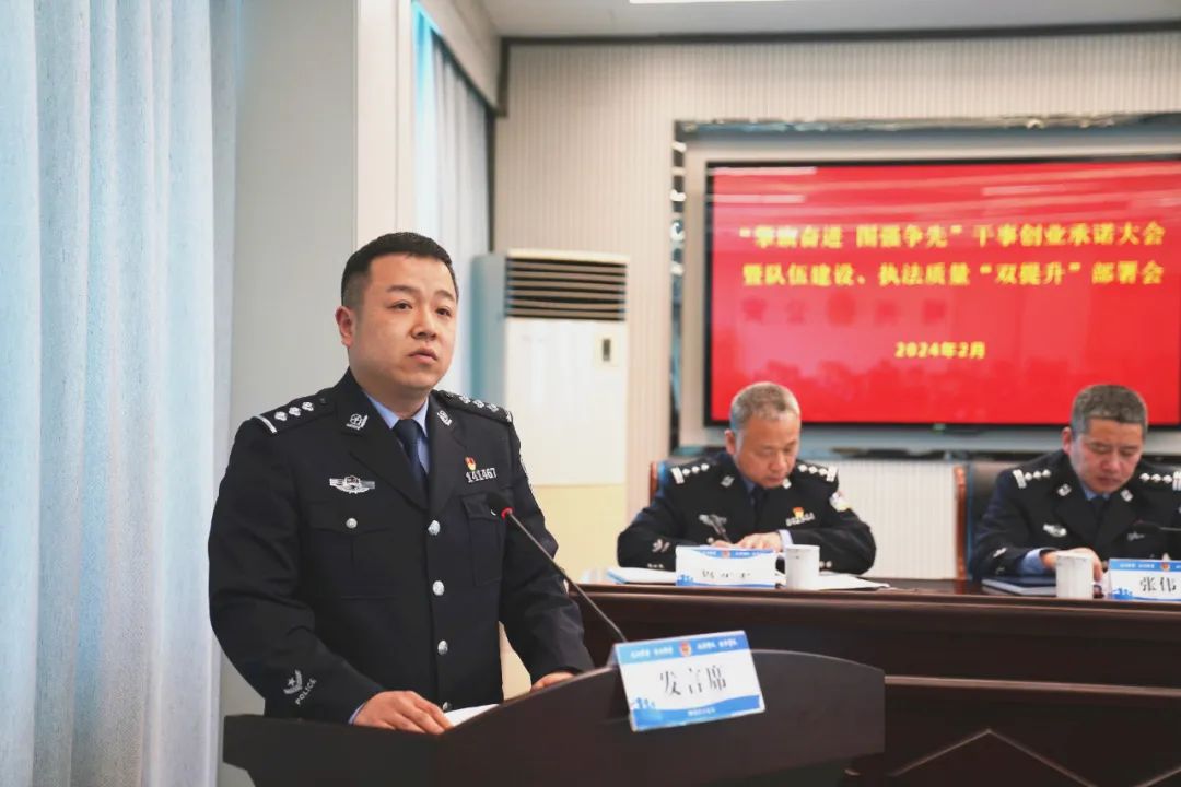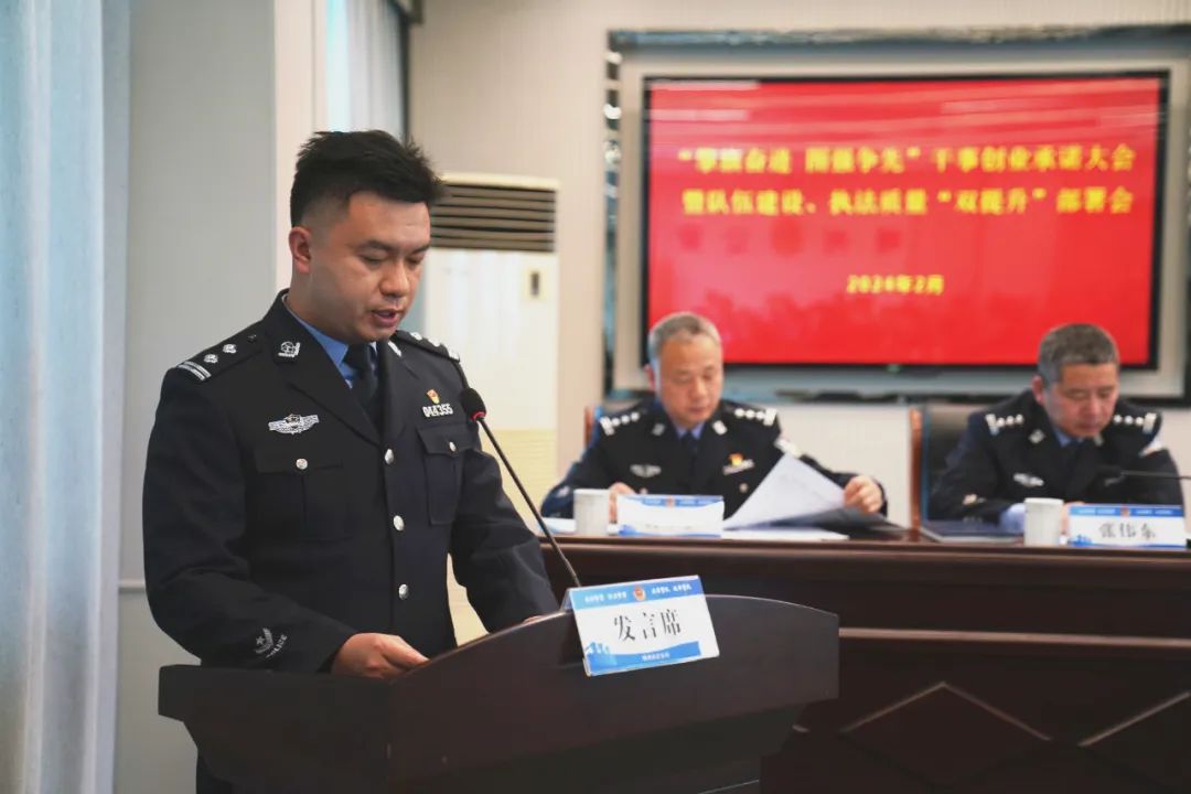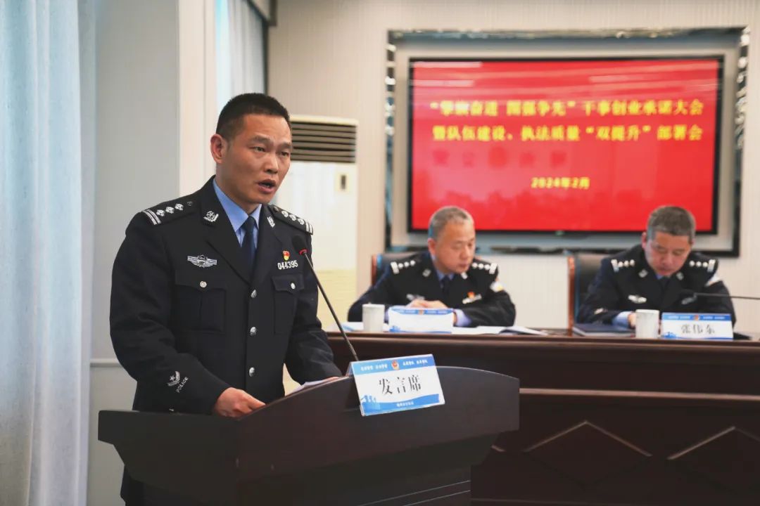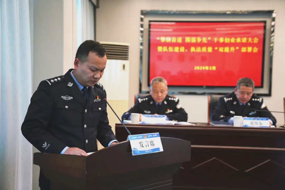 會(huì)上,通報(bào)了2023年度各機(jī)關(guān)單位干事創(chuàng)業(yè)履諾情況及2024年各警種排位指標(biāo)計(jì)劃,部署了隊(duì)伍建設(shè)、執(zhí)法質(zhì)量“提升年”重點(diǎn)工作。交警大隊(duì)、治安管理中心、經(jīng)偵大隊(duì)、巡特警大隊(duì)、浦口所、甘霖所、長樂所等7個(gè)單位主要負(fù)責(zé)人進(jìn)行了交流表態(tài)發(fā)言,并簽訂干事創(chuàng)業(yè)承諾責(zé)任狀。