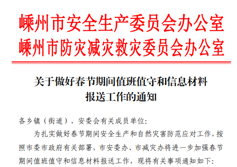 春節(jié)期間,嵊州市認(rèn)真貫徹落實(shí)春節(jié)假期安全防范工作視頻會(huì)議精神,落實(shí)落細(xì)各項(xiàng)安全防范措施,全力抓好節(jié)日期間安全生產(chǎn)和自然災(zāi)害應(yīng)對工作。春節(jié)期間,全市安全生產(chǎn)和自然災(zāi)害形勢總體平穩(wěn),未發(fā)生安全生產(chǎn)和自然災(zāi)害事故。