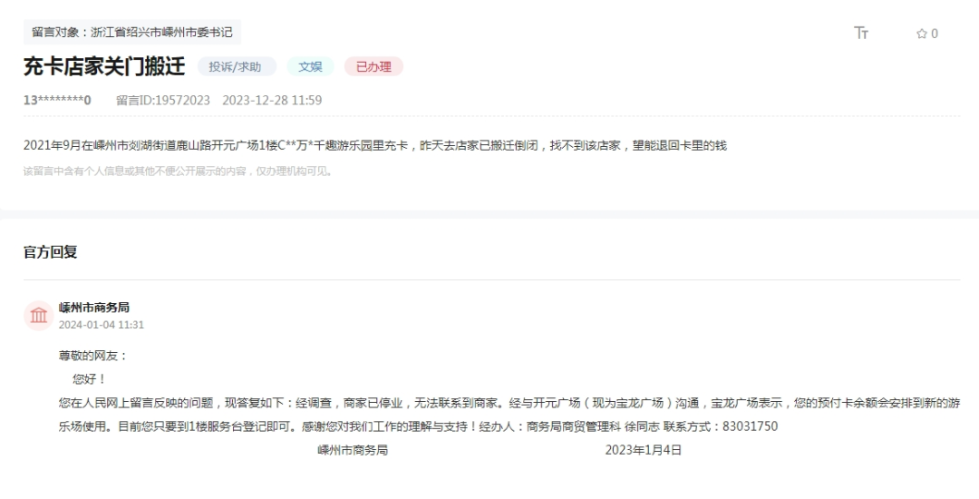 2021年9月在嵊州市剡湖街道鹿山路開元廣場1樓C**萬*千趣游樂園里充卡,昨天去店家已搬遷倒閉,找不到該店家,望能退回卡里的錢。