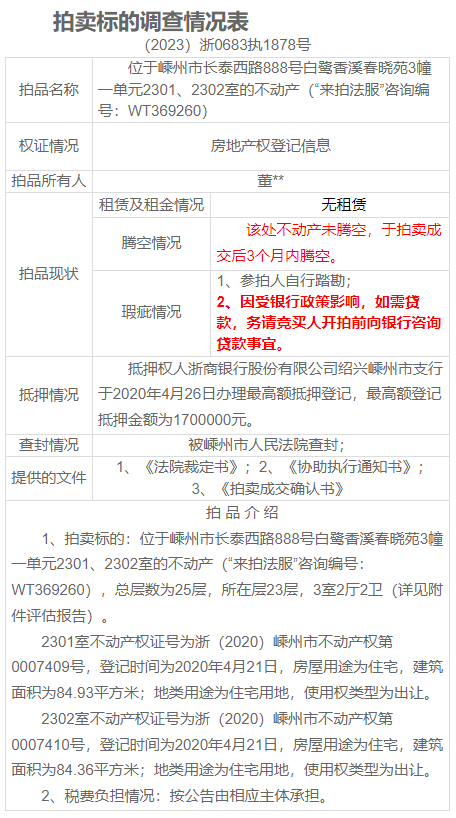 一、拍賣標(biāo)的:位于嵊州市長(zhǎng)泰西路888號(hào)白鷺香溪春曉苑3幢一單元2301、2302室的不動(dòng)產(chǎn)(“來拍法服”咨詢編號(hào):WT369260),總層數(shù)為25層,所在層23層,3室2廳2衛(wèi)(詳見附件評(píng)估報(bào)告)。