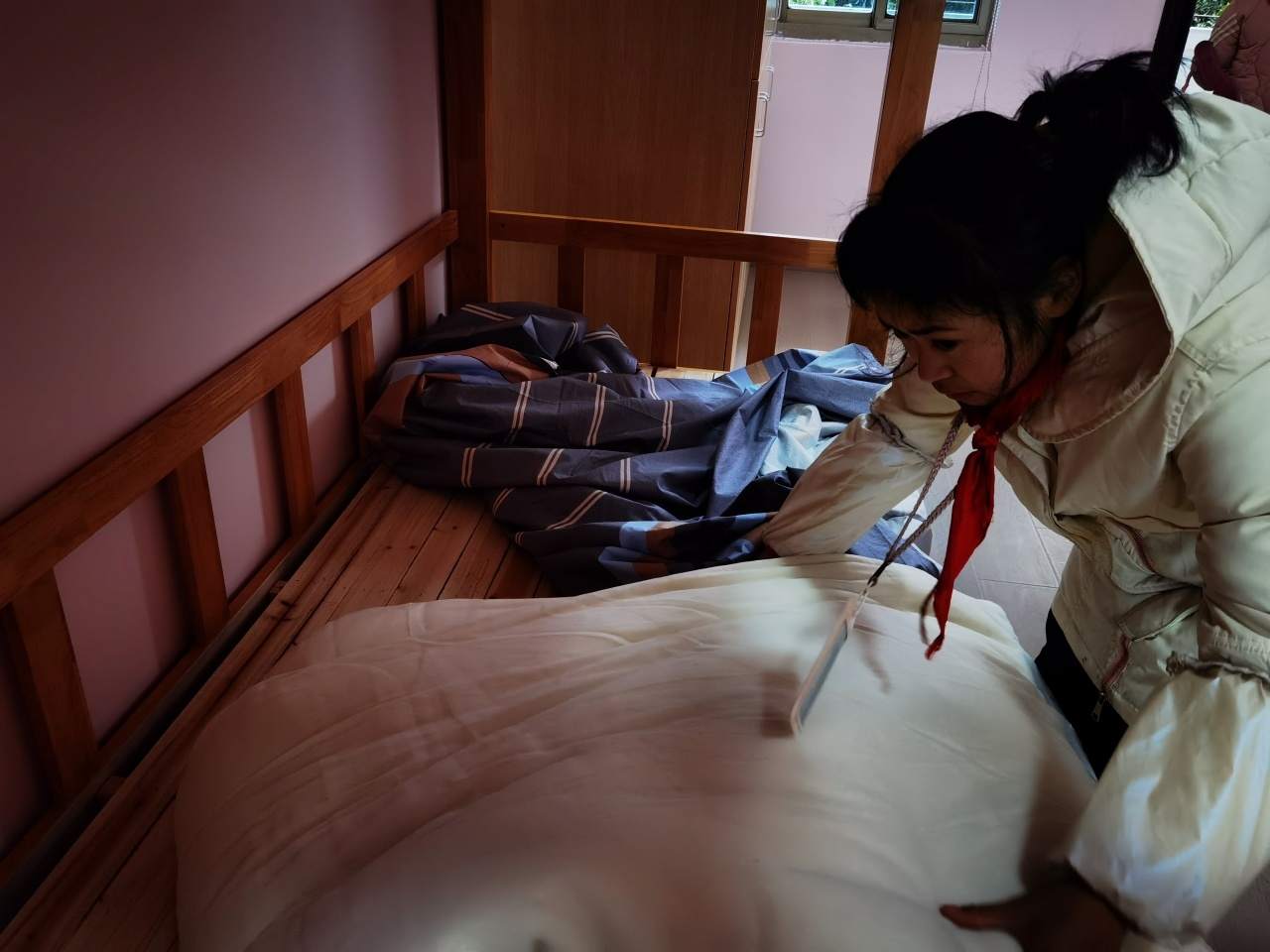 報(bào)到當(dāng)天學(xué)校領(lǐng)導(dǎo)、教師、家長 、學(xué)生一起領(lǐng)被子、鋪被子,布置自己的宿舍。學(xué)校新建的帶熱水器的淋浴房;舒適的床鋪、粉色的墻面,還有新空調(diào)……得到了家長的一致好評。