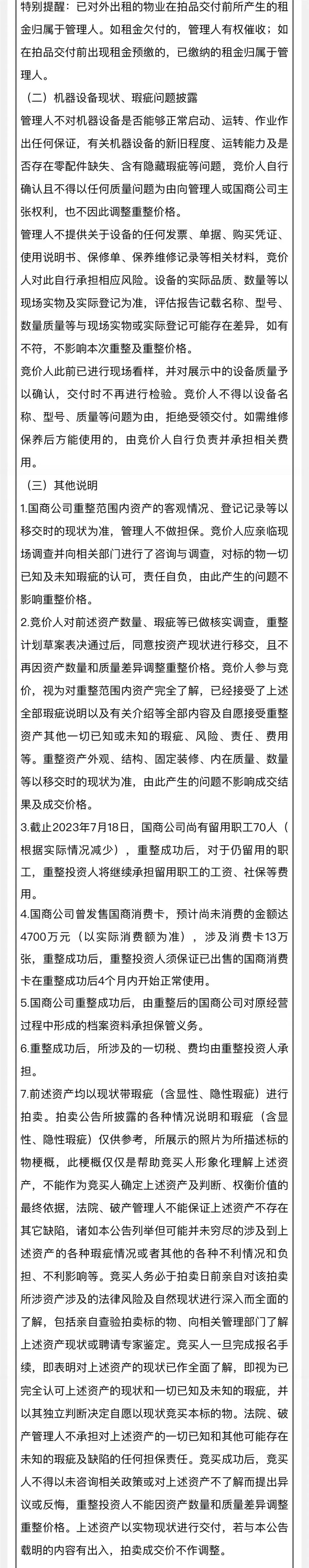 截止2023年7月18日,國(guó)商公司尚有留用職工70人(根據(jù)實(shí)際情況減少),重整成功后,對(duì)于仍留用的職工,重整投資人將繼續(xù)承擔(dān)留用職工的工資、社保等費(fèi)用。