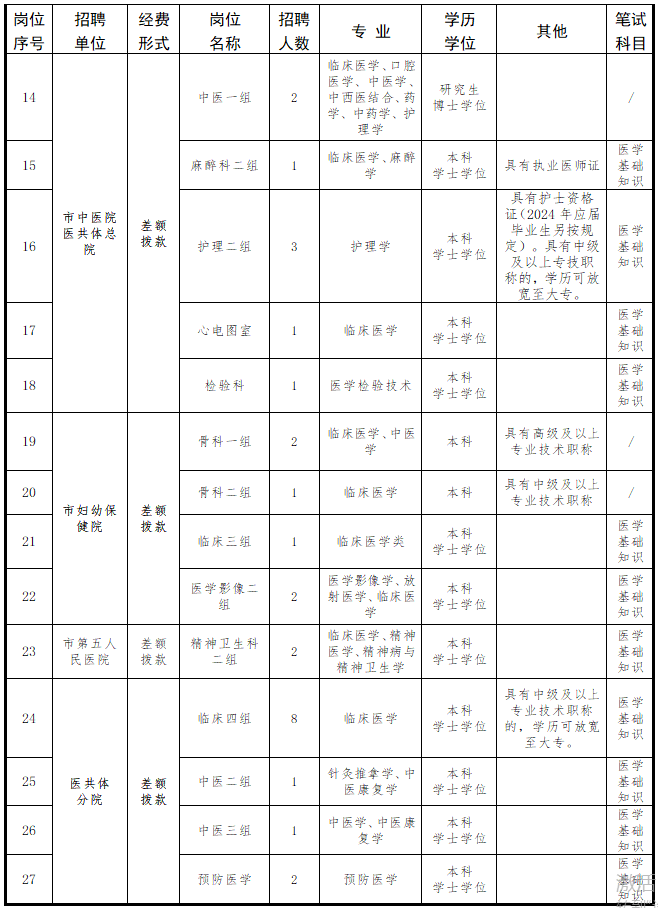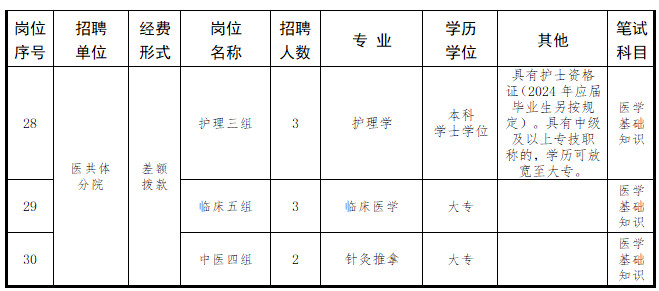 2022年及以前畢業(yè)的考生和研究生學(xué)歷的考生還須提供相應(yīng)的執(zhí)(專)業(yè)資格證書(shū)(或成績(jī)合格證明);研究生畢業(yè)證書(shū)上專業(yè)名稱只有臨床醫(yī)學(xué)等一級(jí)學(xué)科的,還需提供畢業(yè)院校蓋章的研究方向書(shū)面證明;委培生還須提供委托培養(yǎng)單位同意報(bào)考的書(shū)面證明;若應(yīng)聘人員是機(jī)關(guān)、事業(yè)單位在編人員,還應(yīng)提供所在單位和主管部門(mén)同意報(bào)考的證明(同意報(bào)考證明必須在2024年2月14日以后出具的方為有效),不能提供的,視作不符合應(yīng)聘要求。