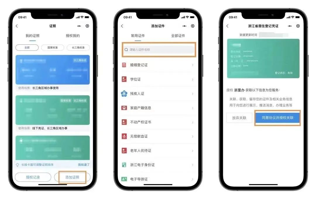 4.確認(rèn)狀態(tài)為成功辦結(jié)后,可前往“我的證照”進(jìn)行“添加證照”,搜索“居住登記憑證”,同意授權(quán)即可成功添加電子憑證。