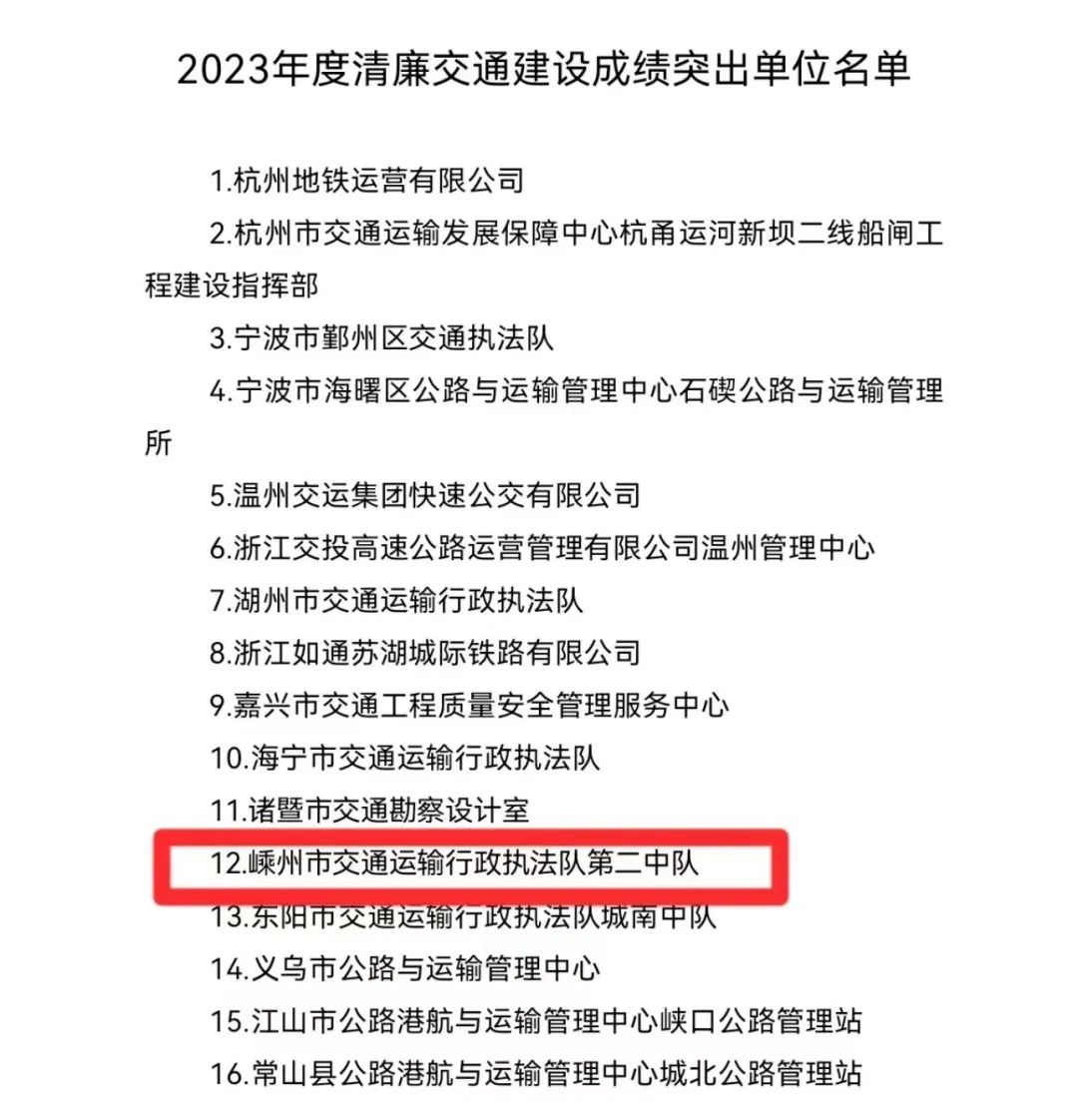 近日,浙江省交通運(yùn)輸廳黨組通報表揚(yáng)了2023年度清廉交通建設(shè)成績突出單位,全省32家單位榜上有名。其中,我市交通運(yùn)輸行政執(zhí)法隊(duì)第二中隊(duì)光榮上榜。