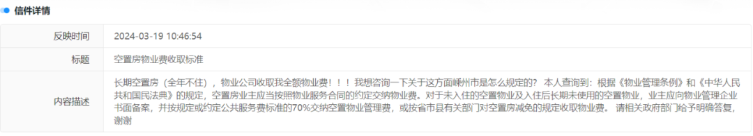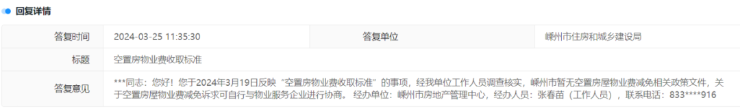 ***同志:您好!您于2024年3月19日反映“空置房物業(yè)費(fèi)收取標(biāo)準(zhǔn)”的事項(xiàng),經(jīng)我單位工作人員調(diào)查核實(shí),嵊州市暫無空置房屋物業(yè)費(fèi)減免相關(guān)政策文件,關(guān)于空置房屋物業(yè)費(fèi)減免訴求可自行與物業(yè)服務(wù)企業(yè)進(jìn)行協(xié)商。經(jīng)辦單位:嵊州市房地產(chǎn)管理中心,經(jīng)辦人員:張*苗(工作人員),聯(lián)系電話:833****916