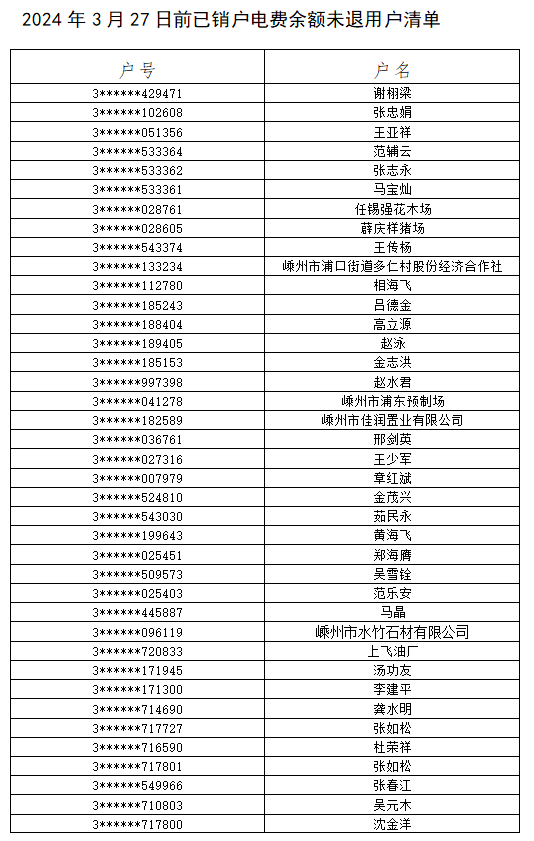 為充分保障您的個人財產(chǎn)不受損失,國網(wǎng)浙江省電力有限公司嵊州市供電公司再次通知已銷戶電費余額未退的電力用戶辦理退費事宜,具體通知如下: