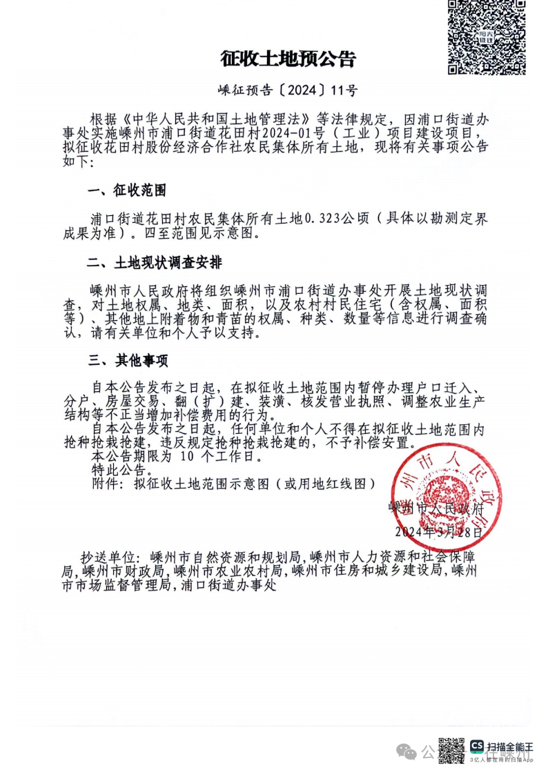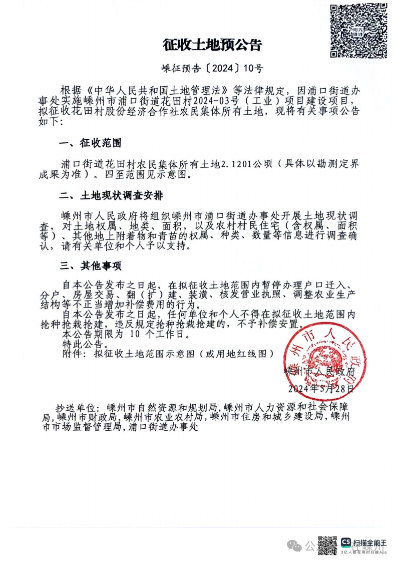 現(xiàn)將征收土地預(yù)公告(嵊征預(yù)告〔2024〕10號(hào))公示如下,詳見下圖: