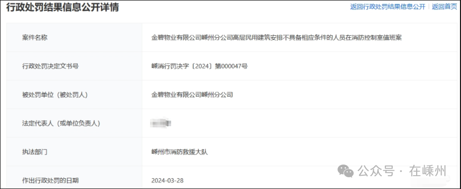 2024年03月11日,嵊州市消防救援大隊(duì)對(duì)金碧物業(yè)有限公司嵊州分公司負(fù)責(zé)管理服務(wù)的位于浙江省嵊州市丹桂路與四海路交叉路口的恒大未來(lái)城小區(qū)進(jìn)行檢查時(shí),發(fā)現(xiàn)該小區(qū)存在高層民用建筑安排不具備相應(yīng)條件的人員在消防控制室值班的行為,屬于嚴(yán)重違法情形,根據(jù)《高層民用建筑消防安全管理規(guī)十七條第四項(xiàng)的規(guī)定,決定給予金碧物業(yè)有限公司嵊州分公司罰款人民幣柒仟元整的處罰,限你單決定書(shū)之日起15日內(nèi)將罰款交至中國(guó)工商銀行股份有限公司嵊州支行各網(wǎng)點(diǎn)。逾期不繳納罰款的,款數(shù)額的百分之三加處罰款,加處罰款的數(shù)額不超過(guò)罰款的數(shù)額。