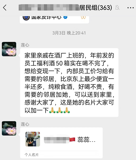 記者了解到,近期多個(gè)業(yè)主群出現(xiàn)“幫妹妹、弟弟處理酒”“拼單駝奶粉”等信息,雖然銷售主體有所不同,但套路基本相同,都是換湯不換藥。
