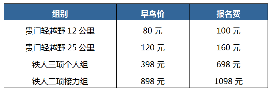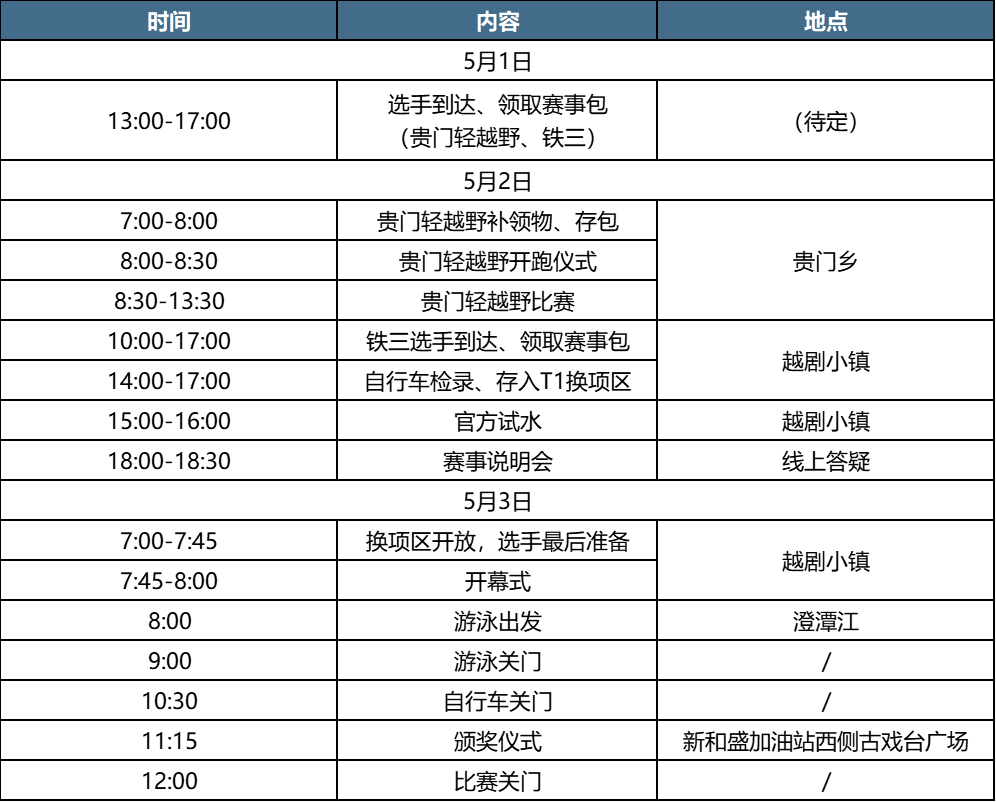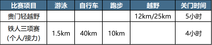 比賽為兩日賽,5月2日為貴門輕越野賽,5月3日為鐵人三項(xiàng)賽。