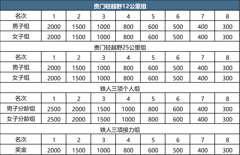(三)貴門輕越野、鐵人三項(xiàng)賽根據(jù)各自組別排名設(shè)置獎(jiǎng)金,獎(jiǎng)金標(biāo)準(zhǔn)如下: