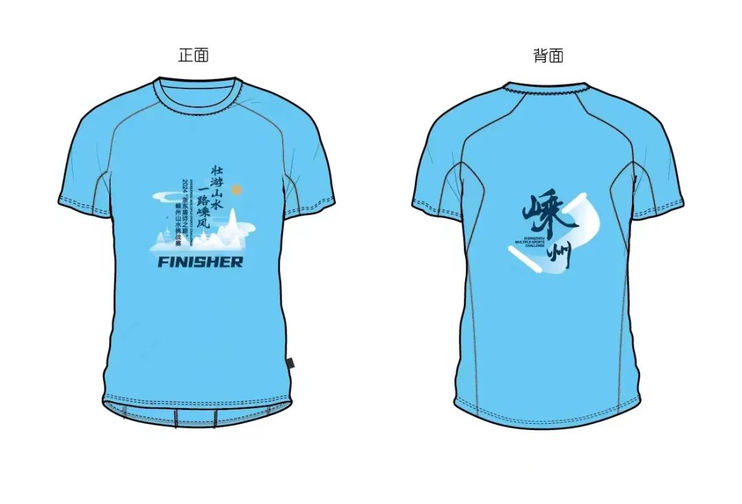 完賽服采用透氣、吸汗的優(yōu)質(zhì)面料,整體藍(lán)色,正面印花融合了嵊州山水元素,并突出“壯游山水,一路嵊風(fēng)“的賽事口號(hào),背面則凸顯“嵊州”字樣。
