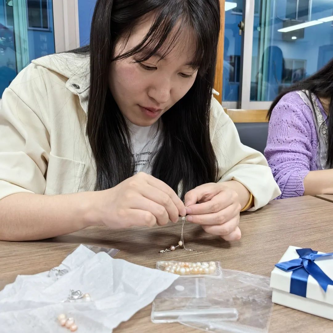 挑選配飾,將珍珠進(jìn)行打孔,做成耳飾、項(xiàng)鏈、戒指等。