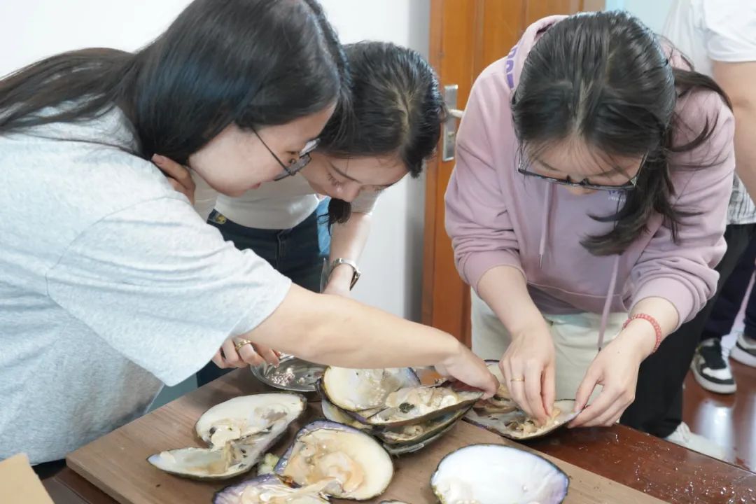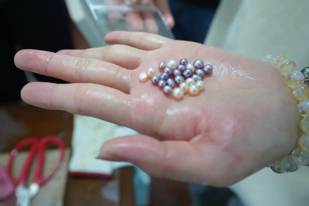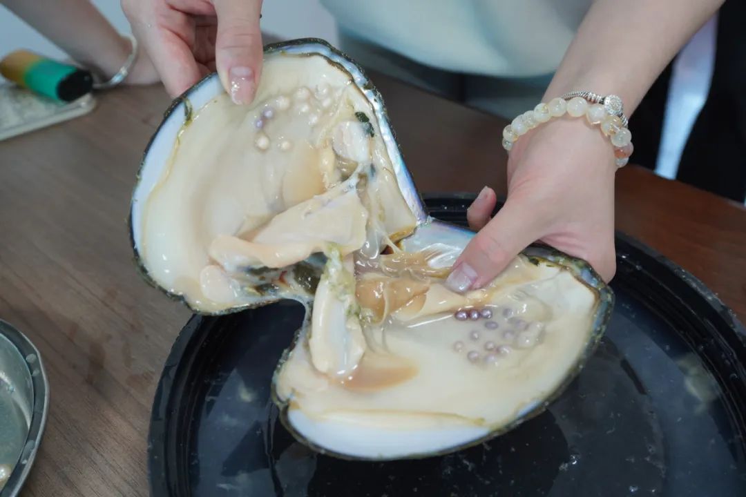 挑選盲盒蚌,用工具打開(kāi),把珍珠從蚌肉里取出,再進(jìn)行清洗,去除雜質(zhì)。