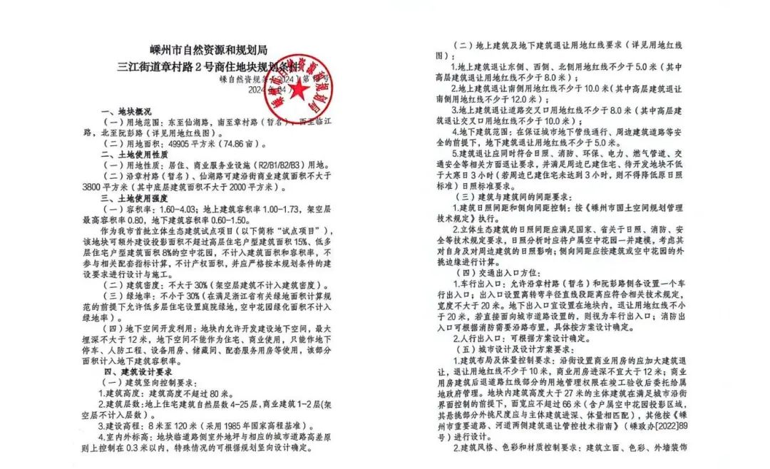 嵊州市三江街道章村路1號、2號商住地塊北至阮彭路,南至章村路,臨近會展中心與阮廟美食街。作為我市首批立體生態(tài)建筑試點項目,將建造第四代住房,又稱庭院房、立體園林生態(tài)住房或城市森林花園建筑,是綠色建筑的衍生品。融匯疊加了中國傳統(tǒng)建筑四合院、街巷胡同、低層別墅以及第三代住房電梯房的特點于一身,并且能向高層建筑形態(tài)發(fā)展,嵊州將迎來屬于自己的“空中城市森林花園”。同時1號地塊規(guī)劃建設(shè)一座公園作為小區(qū)配套。