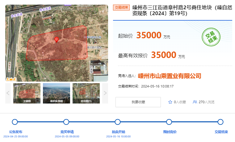 恭喜嵊州市山乘置業(yè)有限公司競拍獲得嵊州市三江街道章村路1號、2號商住地塊,以63400萬元的成交總價,溢價0.00%競得。