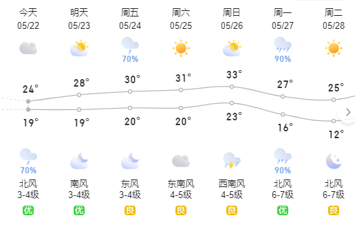 氣溫維持“初夏”模樣,有雨時會有回落,其他時間則較為平穩(wěn),本周最高氣溫在30℃附近,最低氣溫略有抬升,在20℃上下。由于晝夜溫差較大,早晚出門還是有點(diǎn)微涼的,有晨練習(xí)慣的老年朋友還是要多穿一件長袖,以防感冒。