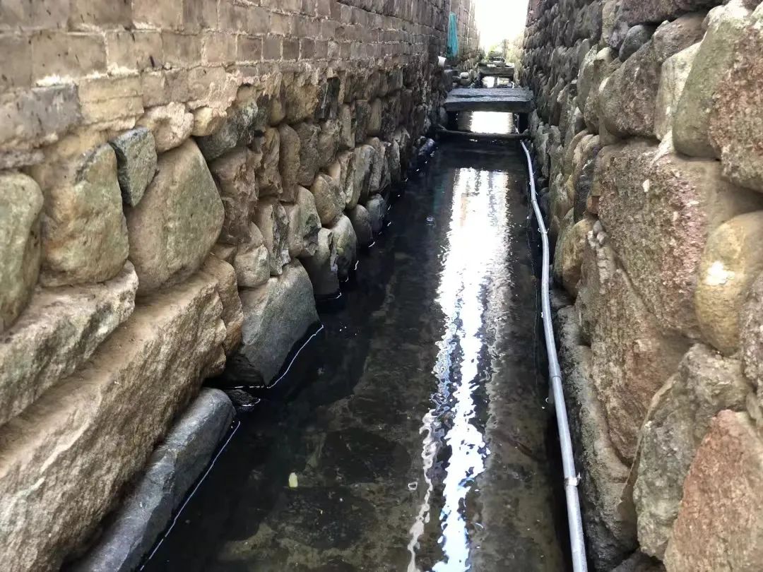 宗祠旁,一條玉帶似的水圳從平溪方向沿墻根奔流而來,顧自穿過屋底的石砌石坎往前奔去,這便是華堂村另一大特色——九曲水圳。當年王氏后人參考曲水流觴設計了這貫穿全村的水圳,不僅平息水患,也解決了村中消防、灌溉的問題。