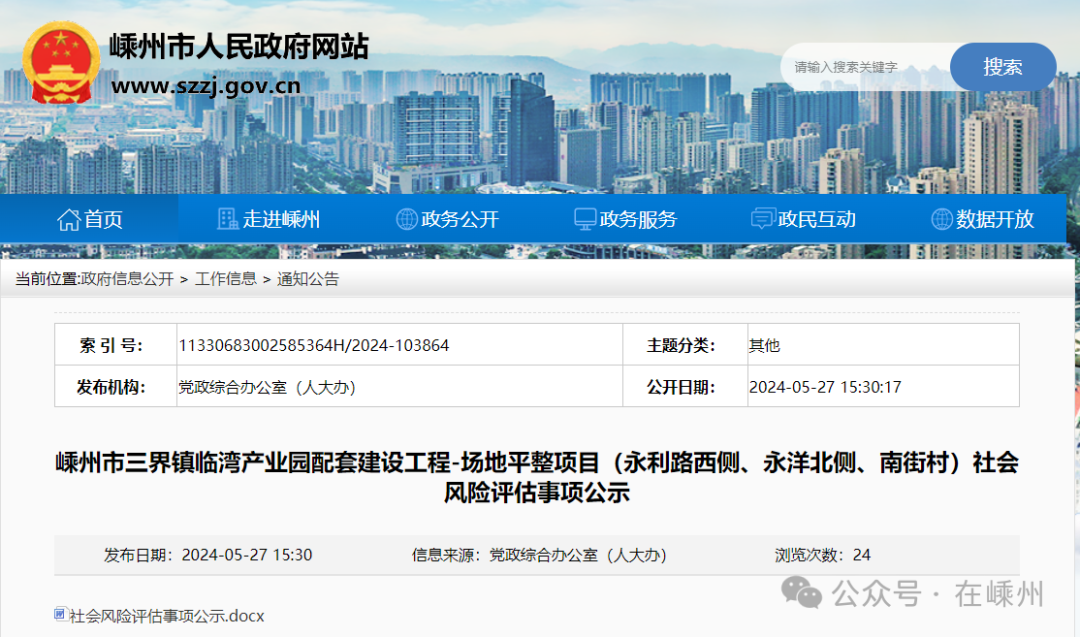 依據(jù)《關于印發(fā)嵊州市重大決策社會風險評估實施細則的通知》(嵊市委辦發(fā)[2020]17號)精神,經(jīng)請示有關部門同意,現(xiàn)對“嵊州市三界鎮(zhèn)臨灣產(chǎn)業(yè)園配套建設工程-場地平整項目(永利路西側、永洋北側、南街村)”進行社會風險評估,現(xiàn)將有關情況予以公示,征詢公眾對該項目的意見。