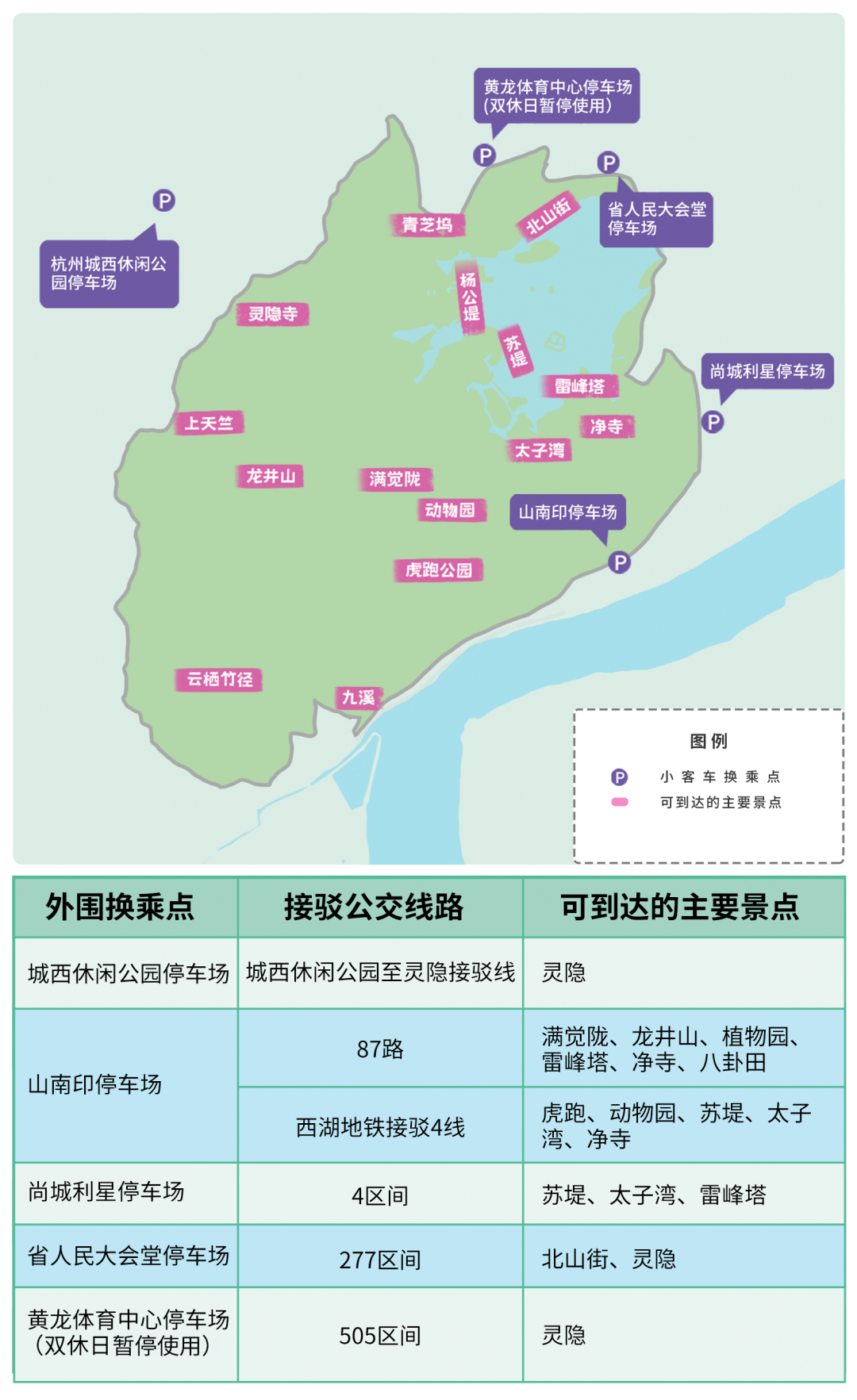 2.“小客車+公交”換乘。在省人民大會(huì)堂、城西休閑公園停車場(chǎng)、山南印停車場(chǎng)、尚城利星停車場(chǎng)、黃龍?bào)w育中心停車場(chǎng)(雙休日暫停使用)提供小客車換乘公交服務(wù),市民游客可換乘“小客車+公交”接駁線直達(dá)西湖景區(qū)內(nèi)部景點(diǎn)。