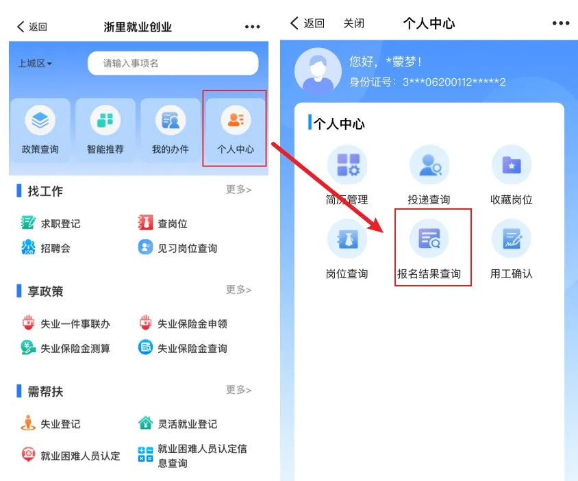 見習(xí)基地收到報(bào)名信息后,審核是否符合崗位需求,并在線反饋報(bào)名結(jié)果。報(bào)名結(jié)果將第一時(shí)間以短信形式通知報(bào)名人員,報(bào)名人員也可以在“浙里就業(yè)創(chuàng)業(yè)”服務(wù)專區(qū)首頁上方進(jìn)入“個(gè)人中心”,選擇“報(bào)名結(jié)果查詢”查看。