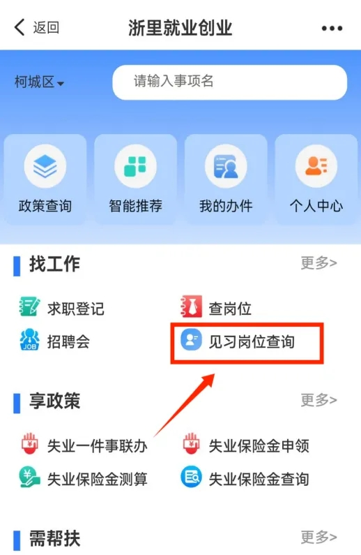 有就業(yè)見習(xí)意向的人員可通過浙里辦APP,搜索“浙里就業(yè)創(chuàng)業(yè)”,進(jìn)入專區(qū)后點(diǎn)擊“見習(xí)崗位查詢”,按轄區(qū)、崗位類別瀏覽見習(xí)崗位,也可通過單位名稱、崗位名稱進(jìn)行搜索。