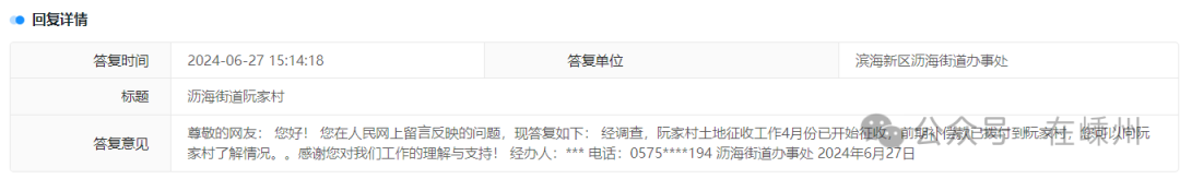 答:經(jīng)調(diào)查,阮家村土地征收工作4月份已開始征收,前期補償款已付到阮家村,您可以向阮家村了解情況。