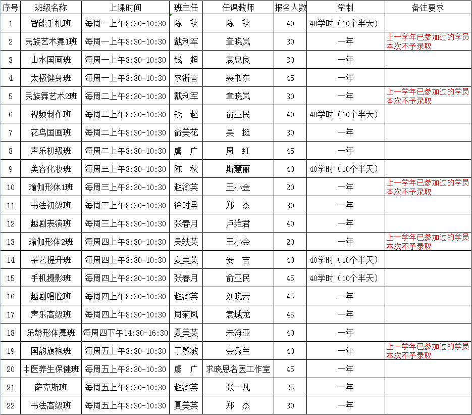 6.學(xué)員可根據(jù)本人的興趣和愛好報名參加2門課的學(xué)習(xí),但不得擅自串班上課。學(xué)校嚴(yán)格控制學(xué)員轉(zhuǎn)班,請學(xué)員們在報名時慎重選擇課程和上課時間。