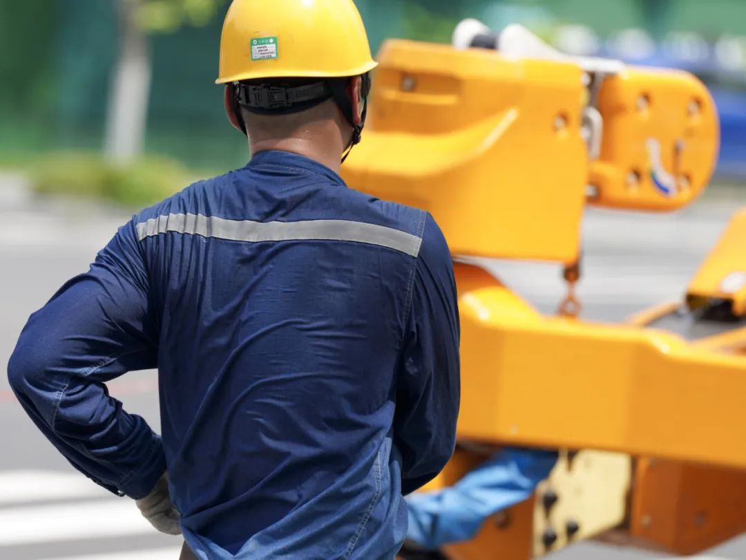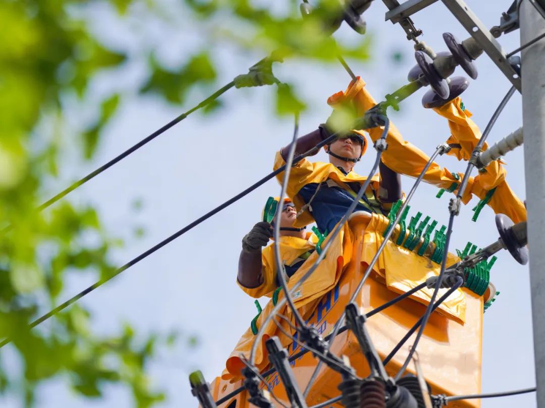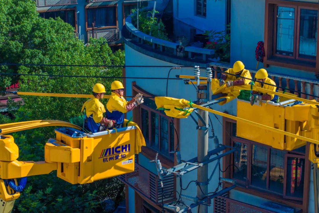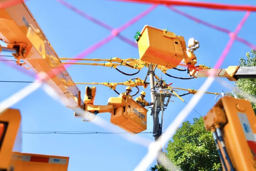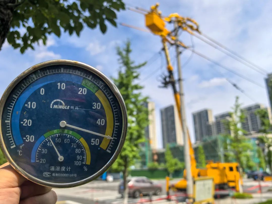 在嵊州,45攝氏度高溫下,電力員工通過帶電作業(yè)消除線路設(shè)備安全隱患,確保市民清涼度夏。
