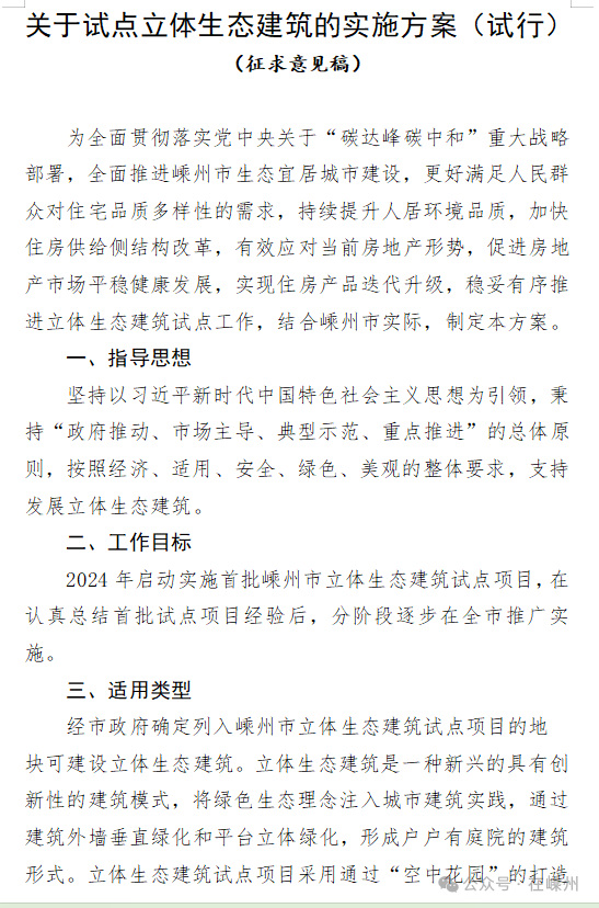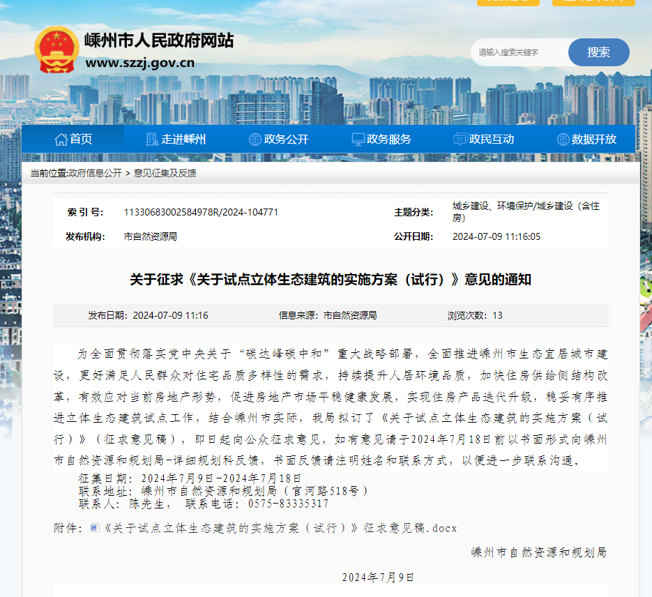 昨日,嵊州市人民政府網(wǎng)站發(fā)布了“關(guān)于征求《關(guān)于試點(diǎn)立體生態(tài)建筑的實(shí)施方案(試行)》意見的通知”