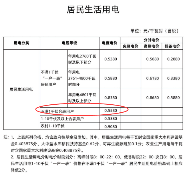 居民合表電價是0.558元/千瓦時,不管用多少電,全年電費都按這個一口價執(zhí)行。