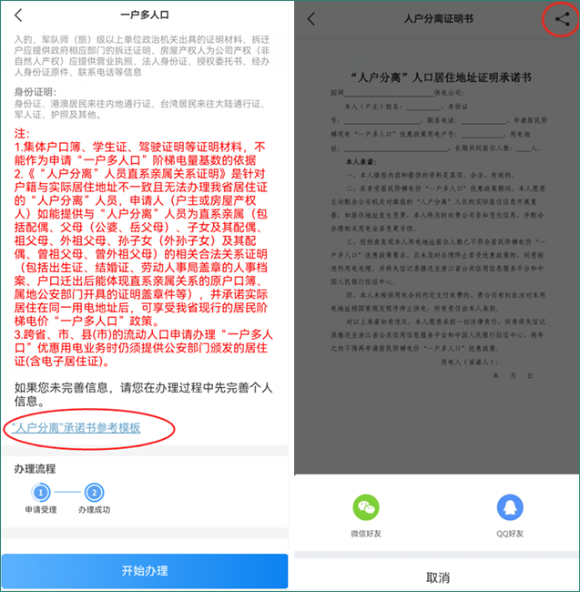 “人戶分離”承諾書參考模版可在【開始辦理】界面進行查看、下載。