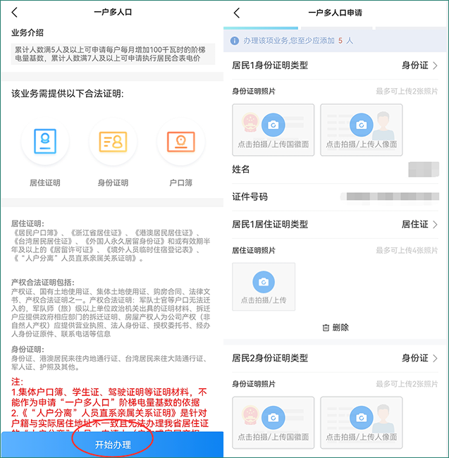 ②選擇戶號進入申請界面,點擊【開始辦理】,按照提示上傳身份證、戶口簿、居住證等資料,提交申請。