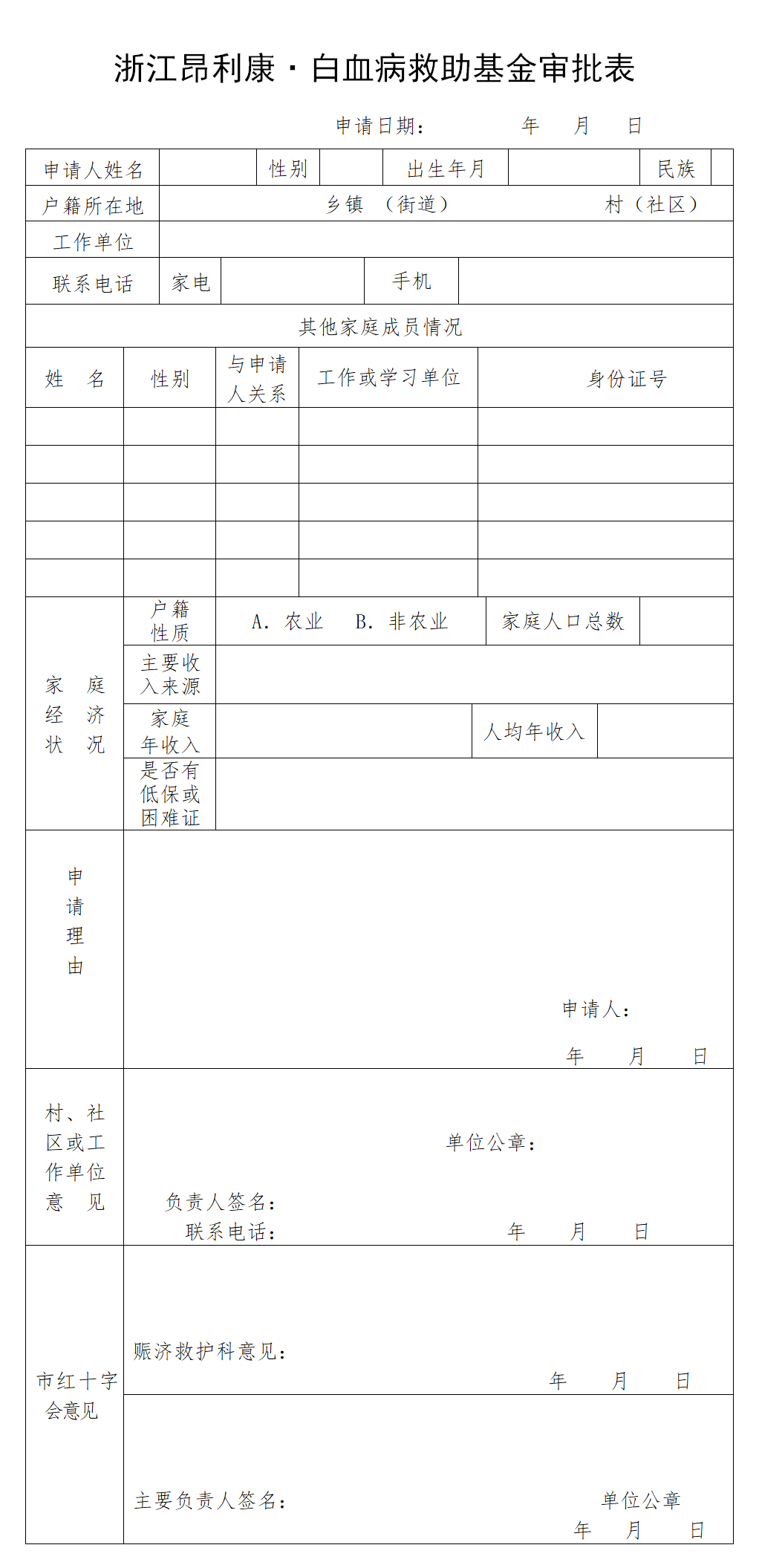 凡申請救助的人員都需填寫《浙江昂利康?白血病救助基金》申請表,經(jīng)申請人所在村(社區(qū))或工作單位核實蓋章后,憑身份證或戶口簿復(fù)印件以及疾病和家庭困難等證明材料,向嵊州市紅十字會申請資助(咨詢電話:83335909)。
