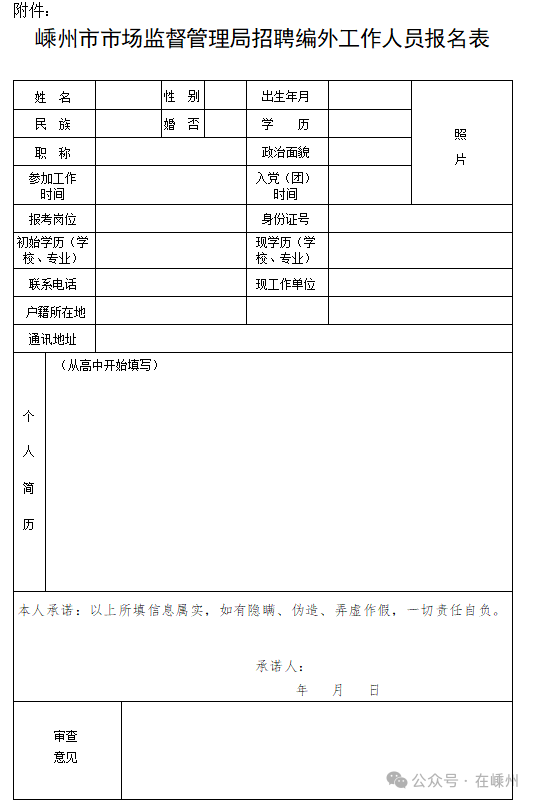 1.嵊州市市場監(jiān)督管理局招聘編外工作人員報(bào)名表(附件)1份,近期一寸免冠照片2張;