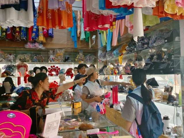 不僅如此,實踐團還走訪了擁有浙江省非遺代表性戲劇服裝制作技藝的黃澤鎮(zhèn),與一家開了十余年的老戲具店店主進行了一次細致且全面的交談。從交談中團隊了解到越劇戲服市場對于價格做工等多方面的需求,以及廣闊的產品銷售范圍與多樣化銷售渠道。這些經驗為團隊成員計劃在東王村引入戲服體驗這一構想提供了產業(yè)基礎與支持。
