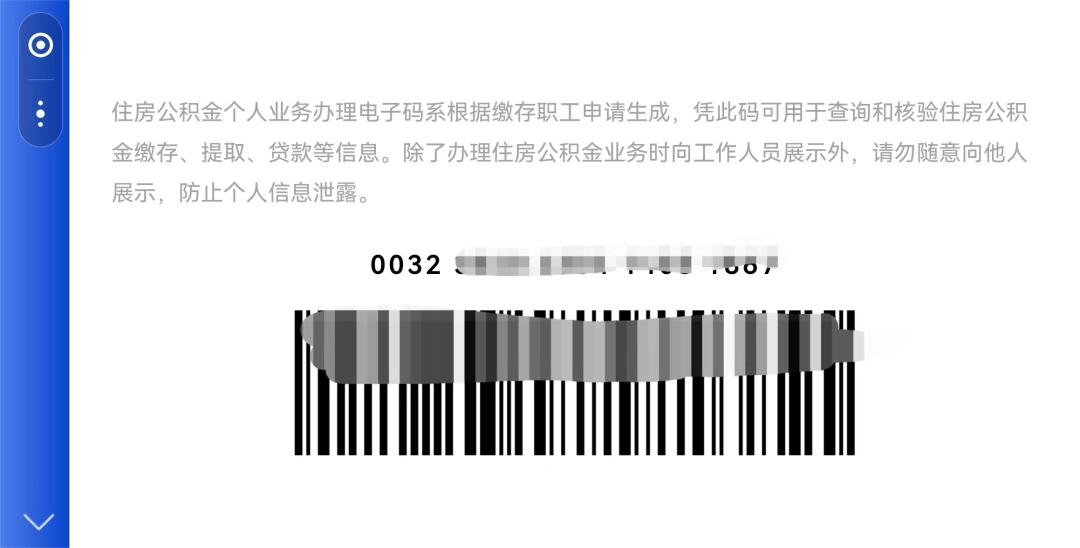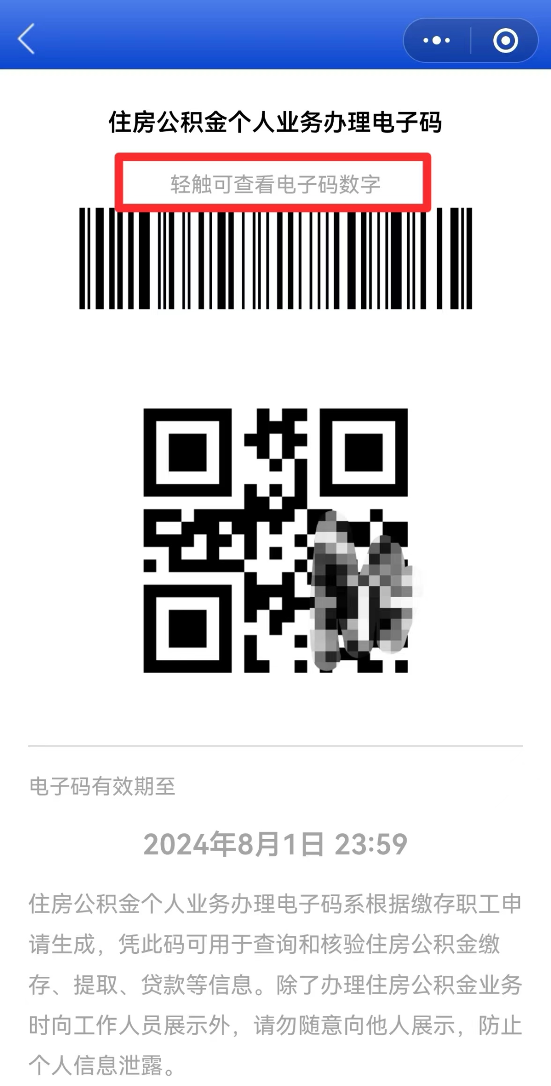 第四步:輕觸條形碼后即可查看電子碼數(shù)字編號(hào),向住房公積金業(yè)務(wù)受理人員出示該編號(hào)。
