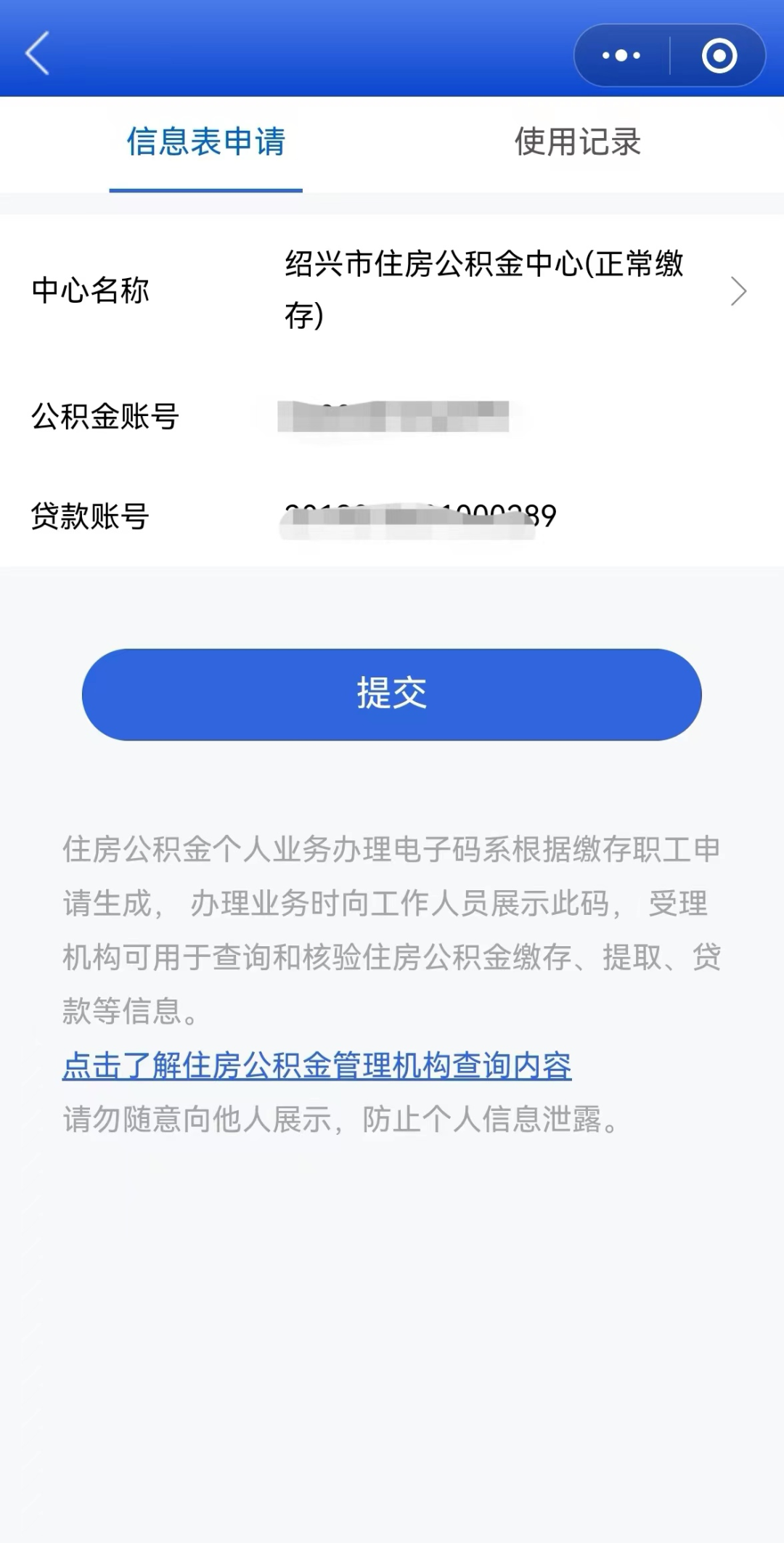 第三步:信息表申請(qǐng)中選擇中心名稱,核對(duì)公積金賬號(hào)后點(diǎn)擊“提交”,提交后即可生成“住房公積金個(gè)人業(yè)務(wù)辦理電子碼”。